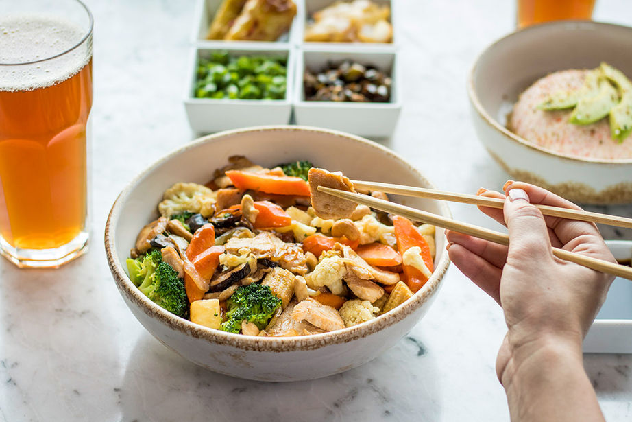 Ingrediente a elegir, verduras, hongos shitake, nuez de la india, salsa Tao Tao y arroz blanco.- Pollo - Mixto (res, pollo y camarón)